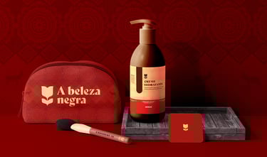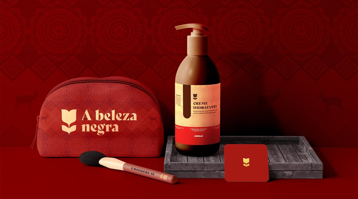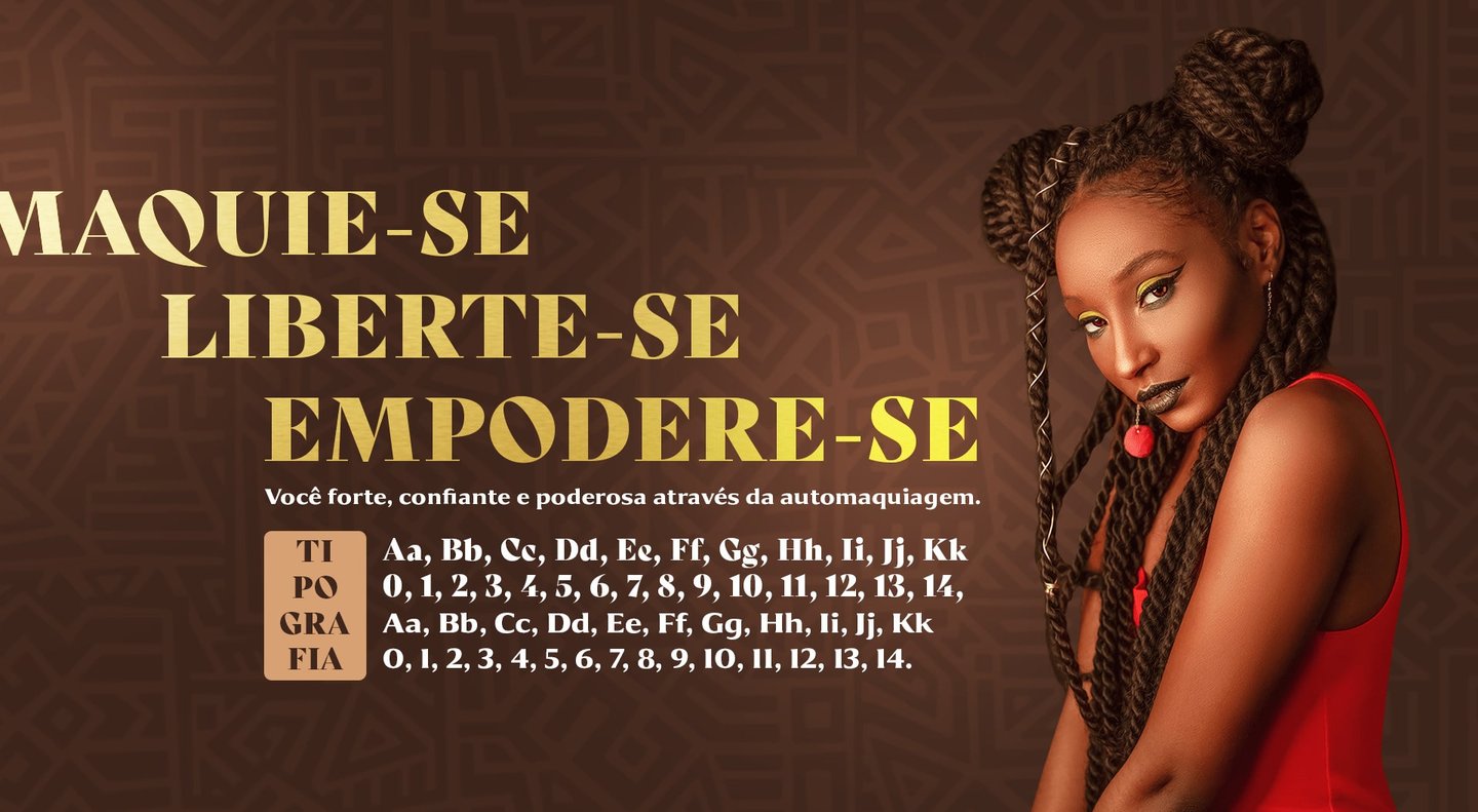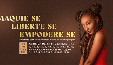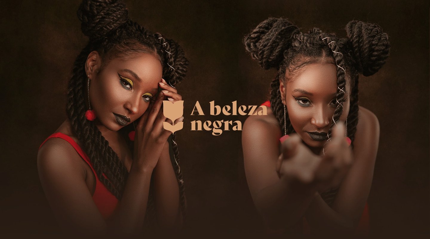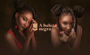 O projeto utiliza imagens de mulheres negras com postura firme e olhares marcantes, fontes elegantes para transmitir força, e uma paleta de cores com tons de marrom, vermelho, laranja e dourado, conectando-se à cultura africana. O logo, em forma de flor, simboliza feminilidade, enquanto o design visual destaca os rostos com iluminação cuidadosa para valorizar a beleza negra e promover empoderamento e inclusão.